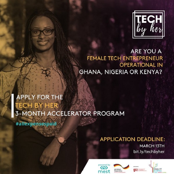 The Tech By Her Accelerator is supporting burgeoning female-led tech ventures in becoming globally competitive and sustainable brands. It is powered by MEST with support from the Tech Entrepreneurship Initiative, ‘Make-IT in Africa’, (implemented by Deutsche für Gesellschaft Internationale Zusammenarbeit (GIZ) on behalf of the Federal Ministry for Economic Cooperation and Development.